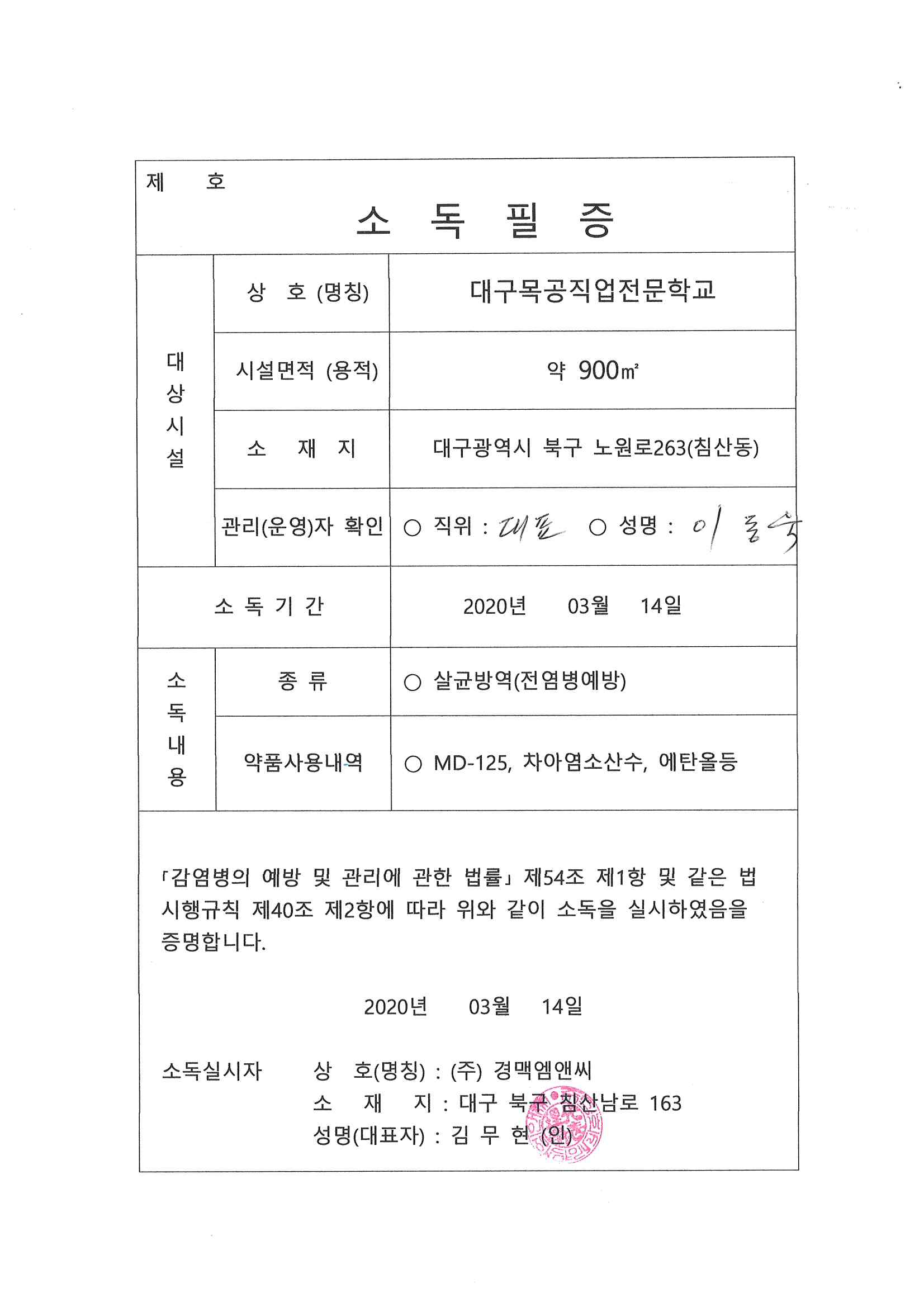 전문업체를 통한 방역실시.