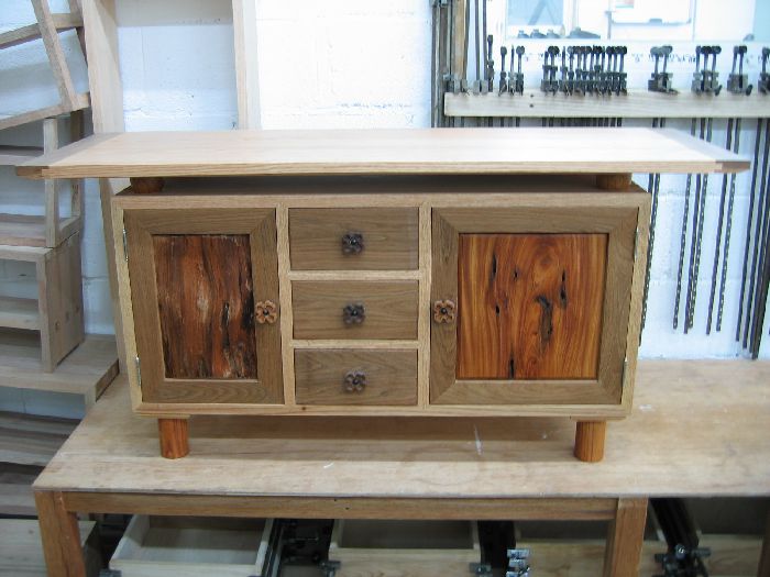 오크, 가죽, 느티, 들미를 이용한 장식장.
