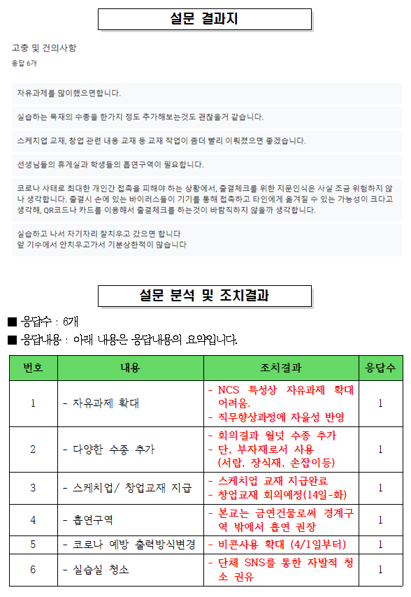 4월 1일 ~ 7일 실시한 훈련생 고충 및 건의사항 결과에 대한 조치사항입니다.