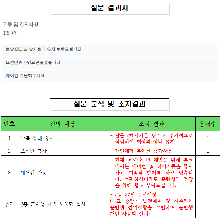 5월 1일 ~ 8일 실시한 훈련생 고충 및 건의사항 결과에 대한 조치사항입니다.