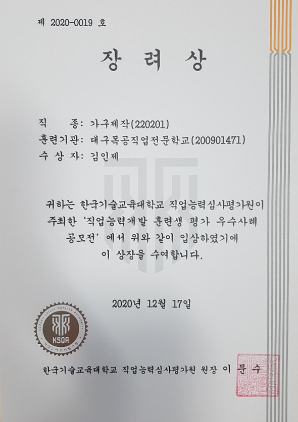[2020년] 장려상 - 직업능력개발 훈련생 평가 우수사례 공모전