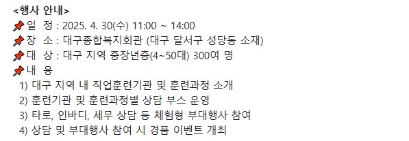 대구지역 40~50대 중장년층을 대상으로 다양한 분야의 우수 직업훈련과정을 소개하고